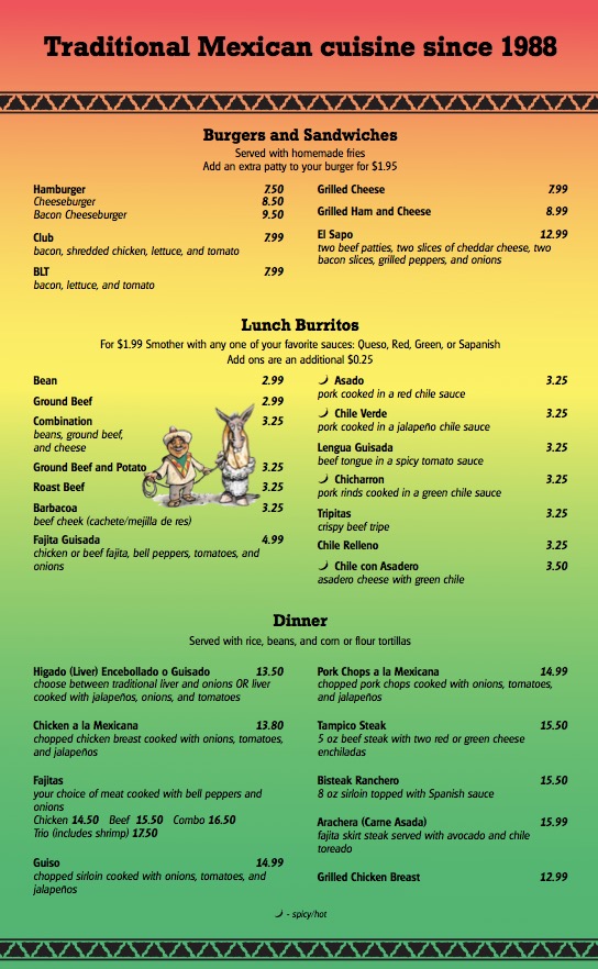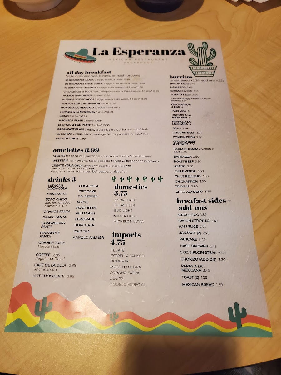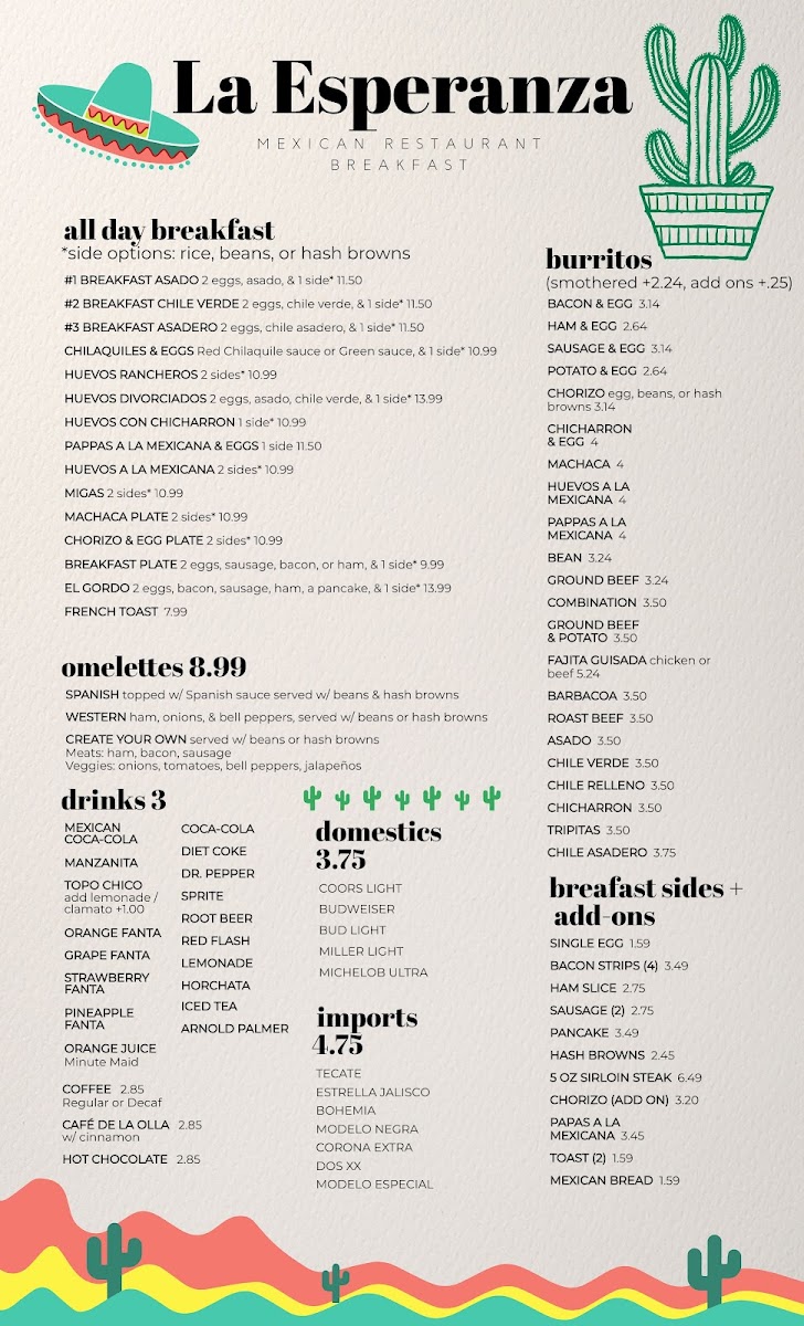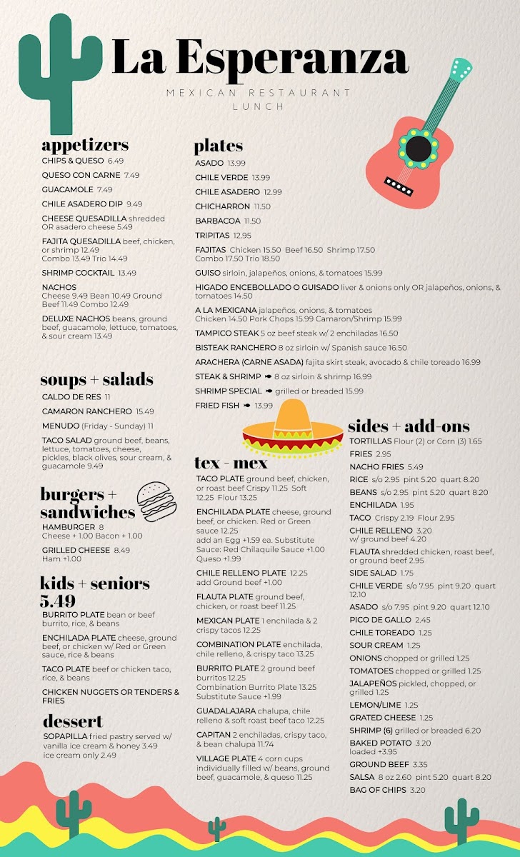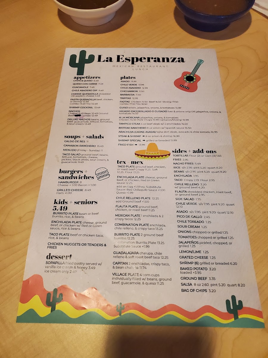 La Esperanza Mexican Restaurant stands as a vibrant homage to authentic Mexican cuisine, located in Odessa, Texas. The menu is a delightful blend of traditional flavors, featuring hearty options like Caldo De Res, Menudo, and a fresh Taco Salad. The culinary journey doesn’t stop at soups; one must indulge in their signature dishes like Chicken Enchiladas with Green Sauce and the highly recommended guiso plate. The ambiance is lively, making it perfect for gatherings, though expect some noise. Complementing the food is an extensive drink selection, from classic Coca Cola to rich Café De La Olla. Customer reviews praise the attentive service and the nostalgic flavors, suggesting a trip back to your favorite dining memories. On Mondays, try their special Higado Encebollado, a true testament to their commitment to authentic fare. Come for the food, stay for the experience!
